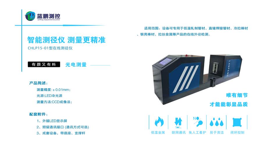 在線測徑儀型號種類多樣,不同的測徑儀測量范圍、應用行業、適用環境等各不相同,一般是根據生產廠家實際生產情況進行測徑儀的定制。CHLP15-01型在線測徑儀可用于低溫軋制管材、直縫焊接管材、冷拉棒材、銀亮棒材、橡膠管、塑料管、電線、電纜等多種