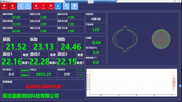 10)測量數據“超差”、測徑儀溫度“超溫”、風機壓力過低自動報警功能。