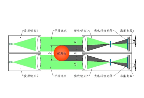 圖中2套發射鏡頭分別發射出平行光射向2套接收鏡頭,通過接收鏡頭內的透鏡使平行光束在光電轉換元件CCD芯片上成像。當2束平行光內放入被測物時,在光電轉換元件的像上就會出現陰影,設其寬度分別為L1、L2。經過對光電轉換元件發出的電信號的處理和計算可以得出L1、L2所對應的尺寸A1、A2,A1加A2再加上兩個鏡頭之間的凈間距B即可得出被測物的尺寸D。