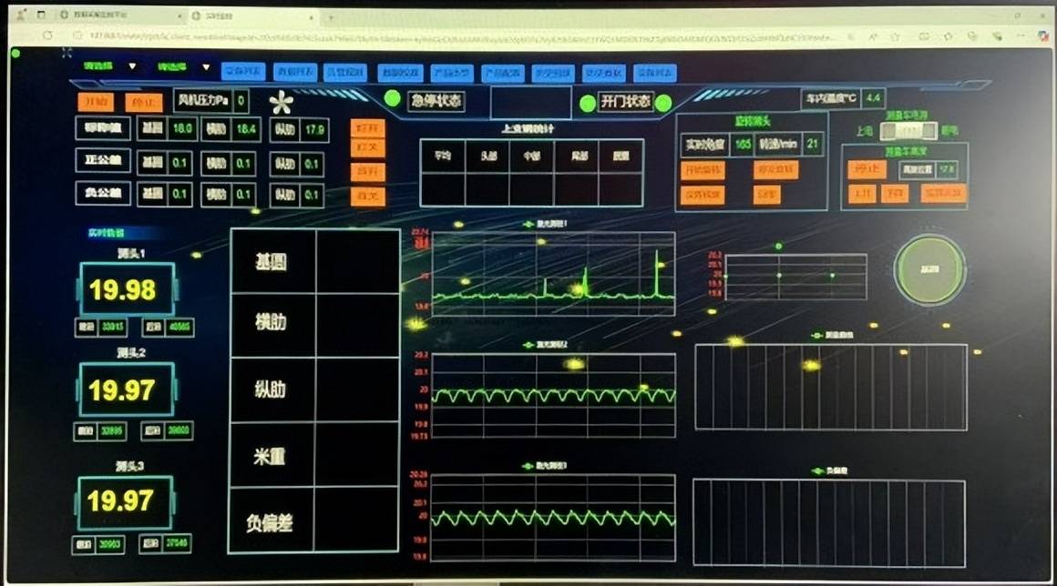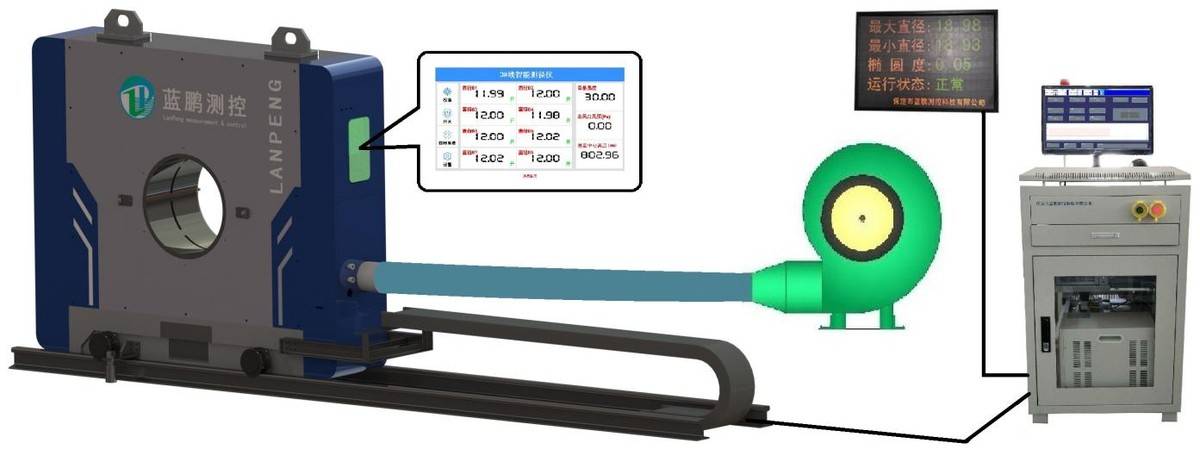 主控室液晶顯示器:管材截面的最大/最小直徑、平均值、橢圓度;螺紋鋼基圓、縱肋、橫肋、米重、負偏差、錯輥等實時測量值;各路測頭的分項測量值;設定的鋼管長度、速度、標稱直徑、上下公差等;尺寸波動趨勢預報(輸入鋼管長度和速度后可以對應外徑在管材的位置),缺陷分析曲線。
